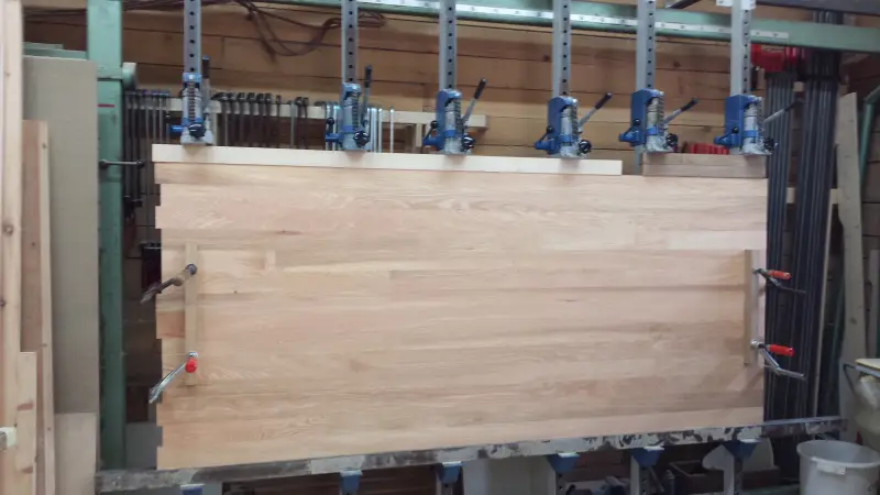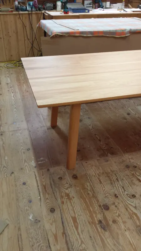 Auf der größten Bandsäge des Landes wurde dieser dann zu Brettern geschnitten. Die Sägearbeiten gestalteten sich etwas schwierig, da immer wieder Fremdkörper durschnitten wurde. So befand sich im oberen Stamm ein Elektroisolator der ca. 60cm tief eingewachsen war. Der Isolator gehörte vermutlich zu den ersten Freileitungen der Stadtwerke. Als die Bandsäge hier durchschnitt fehlten einige Zähne beim Blatt. In der Tischplatte ist dies an einer leichten dunklen Färbung bei zwei Brettern zu erkennen.